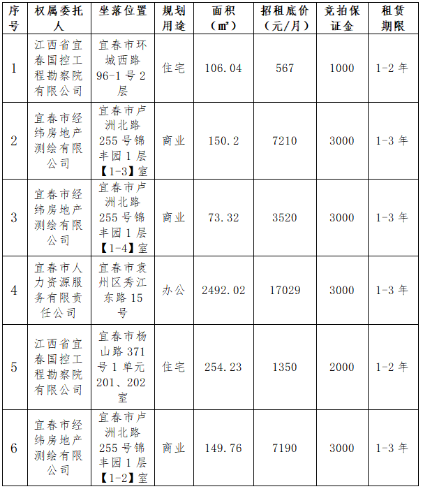 公司定于2025年8月12日下午15:30在宜春市國有資本控股有限公司會議室面向社會公開招租:2個住宅類資產(chǎn)的使用權(quán)、1個辦公類資產(chǎn)的使用權(quán)、3個店面類資產(chǎn)的使用權(quán)(資產(chǎn)可以整租也可以分租)。現(xiàn)將有關(guān)事項公告如下:
