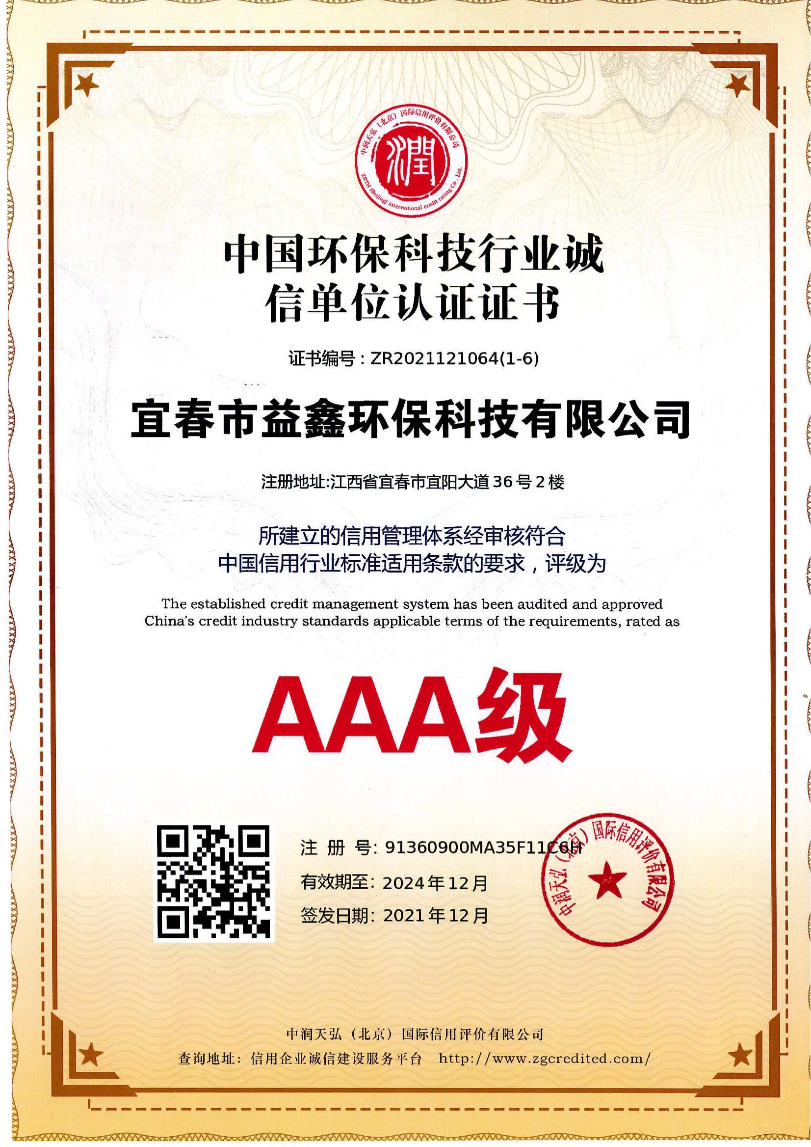 AAA級(jí)中國(guó)環(huán)保科技行業(yè)誠(chéng)信單位認(rèn)證證書
